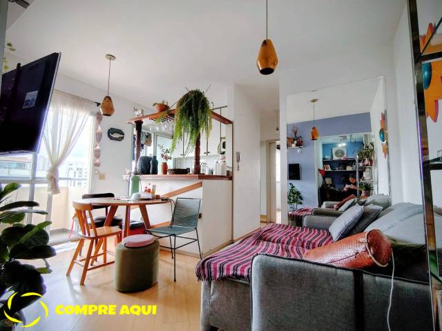 O imóvel a venda possui 50 metros quadrados bem distribuídos em 1 sala para dois ambientes integrada a sacada, cozinha americana com armário embutido, área de serviço, 2 dormitórios e 1 banheiro. O apartamento tem boa ventilação natural, gás encanado, interfone e vaga de garagem.